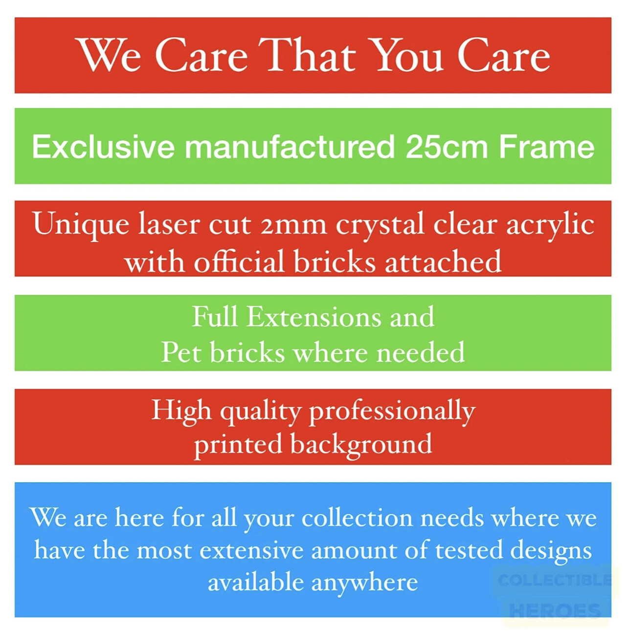 • Bricks are placed on Crystal Clear Acrylic which means that the display picture can be changed to make this as unique as the minifigures placed in it.