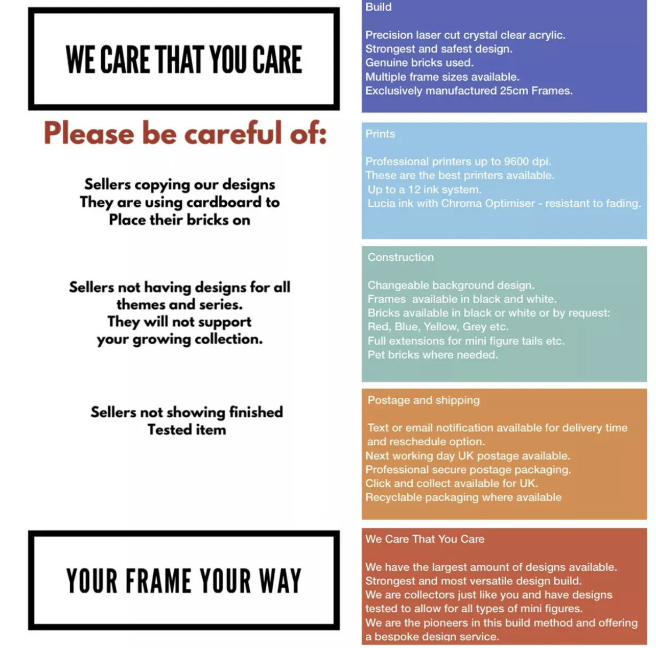 Our frames are produced differently to other designers. Other designers use a fixed method. This means that the item is printed with one design that cannot be changed or updated at all. This is printed on card with the bricks attached to the card, making them very weak and easily damaged.