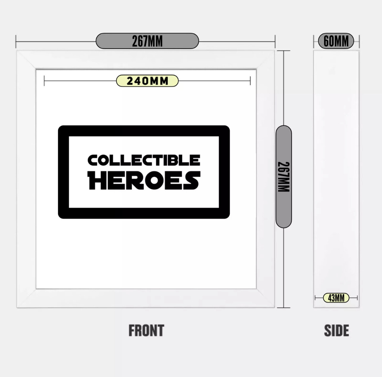 The external size is 267mm x 267mm x 60mm deep.