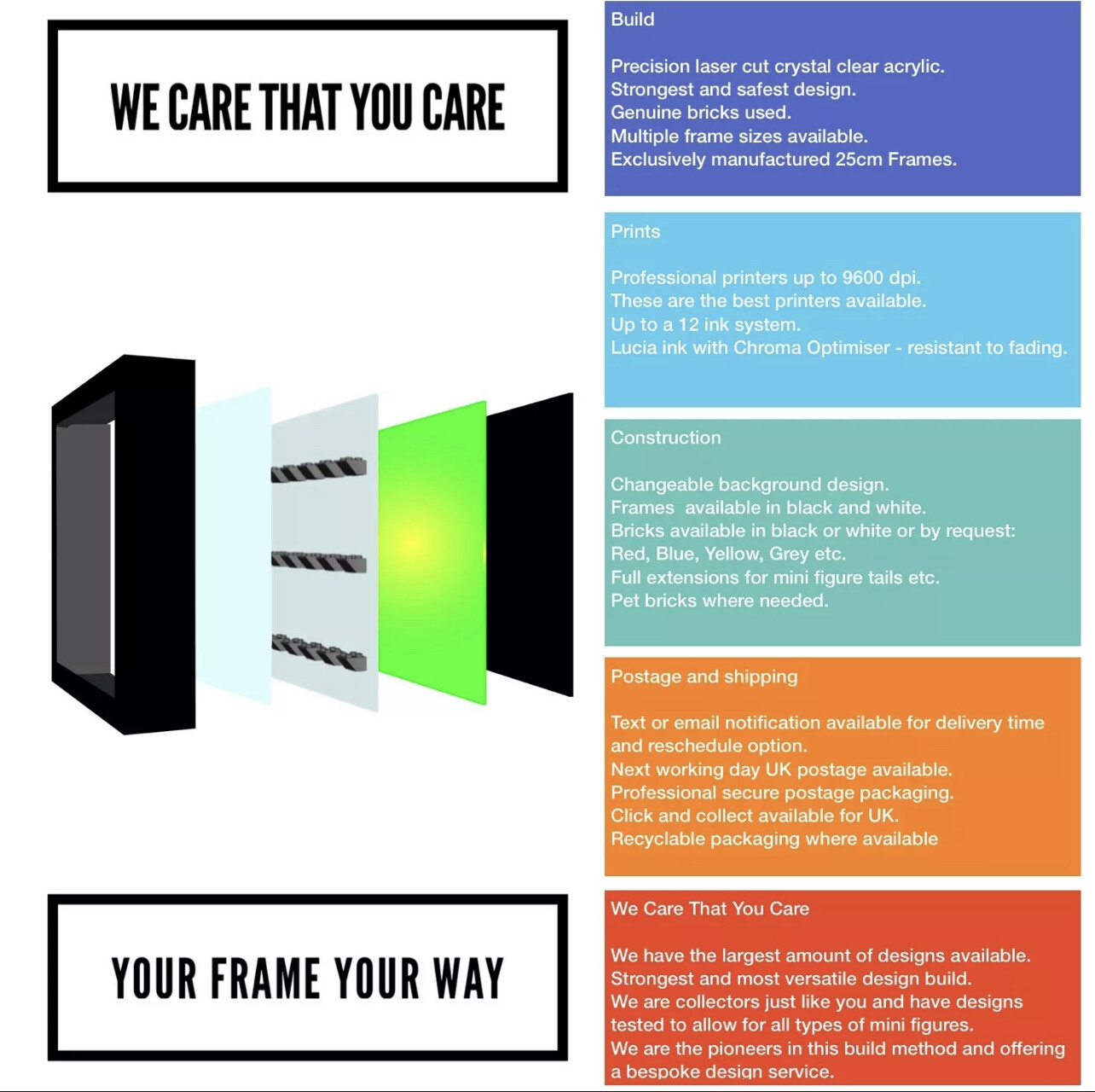 Our frames are produced differently to other designers. Other designers use a fixed method. This means that the item is printed with one design that cannot be changed or updated at all. This is printed on card with the bricks attached to the card, making them very weak and easily damaged.